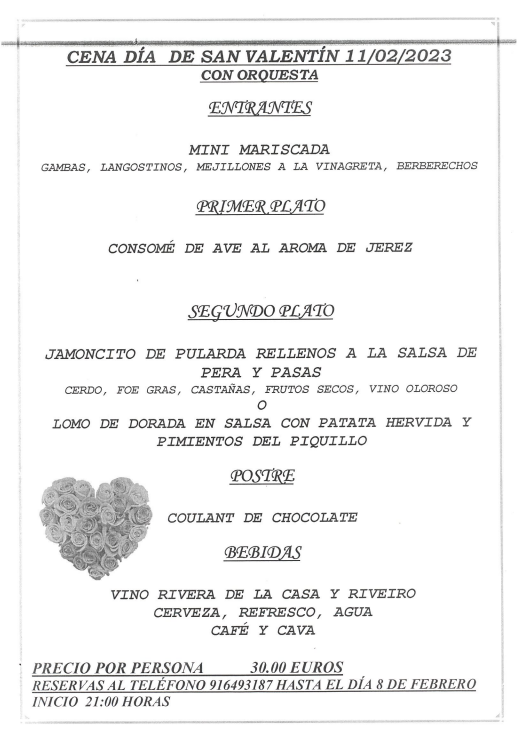 Se informa a los Sres Usuarios de la cena de San Valnetín que se celebrará el próximo 11 de Febrero en la cafetería.