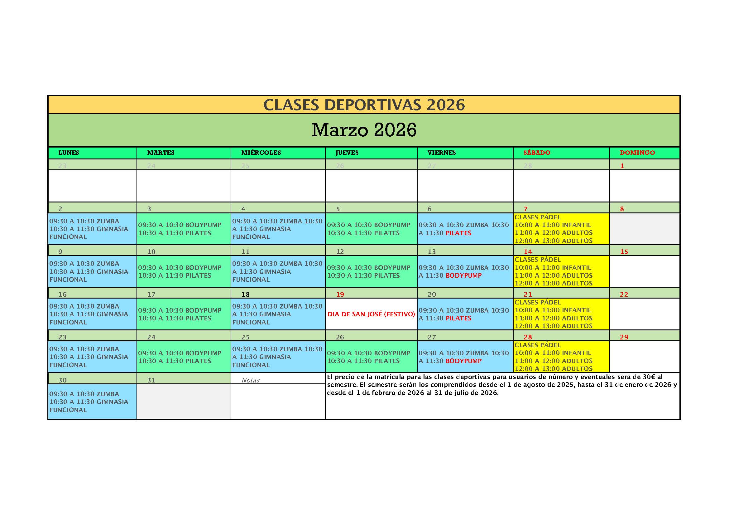 Clases deportivas marzo 2026