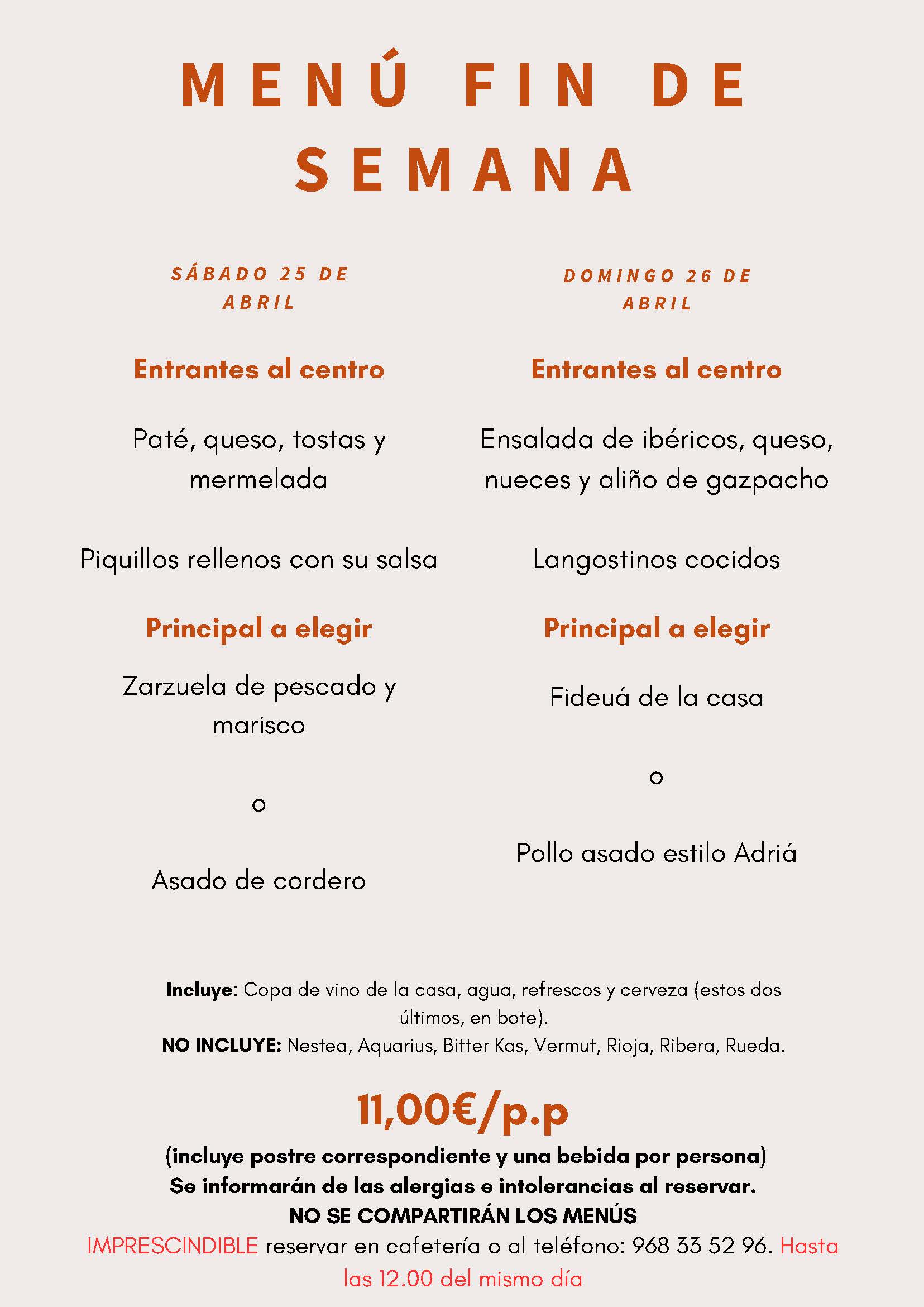Menús fin de semana 25 y 26 de abril 2026