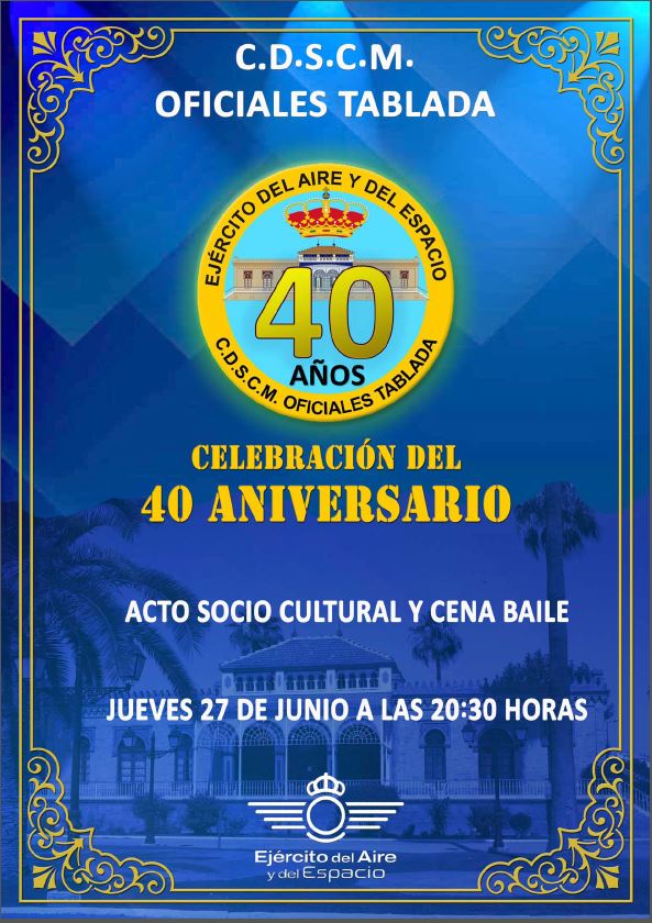 Con motivo del 40 aniversario de la creación del Club de Oficiales Tablada, se celebrará en este Centro un acto sociocultural el jueves 27 de junio a las 20:30 horas, con la participación de la Banda de Música del Acuartelamiento Aéreo de Tablada, que finalizará con una cena especial con baile.