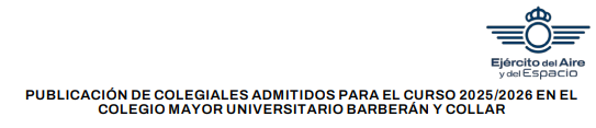 PUBLICACIÓN DE COLEGIALES ADMITIDOS PARA EL CURSO 2025/2026 EN EL COLEGIO MAYOR UNIVERSITARIO BARBERÁN Y COLLAR