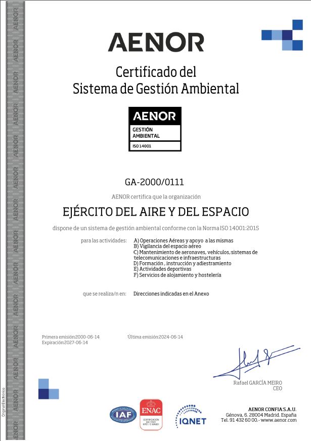 Obtención del Certificado de Gestión Ambiental (AENOR) Certificado ISO 14001:2015 en Gestión Ambiental (GA-2000/0111), para la actividad de vigilancia del espacio aéreo.